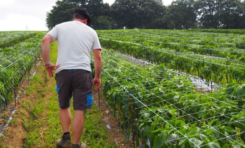 Chaque rangée de pied de piment est désherbée 2 à 3 fois dans la saison. Le désherbage mécanique et manuel, à la lisière extérieure de la bâche permet d'économiser l'eau de pluie. Sans ce désherbage, l'herbe ramperait jusqu'au pied de piment.